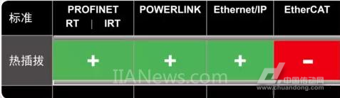 POWERLINK,Ethernet/IP和PROFINET提供了用户热插拔能力,而对于SERCOSIII和EtherCAT由于其必须采用环形拓扑结构而受到了一些限制,SERCOSIII允许将一个节点踢出网络,在这种情况下,相邻的两个节点接近TX和RX线路,节点可以通过主站到达另一个。EtherCAT不支持热插拔能力。
